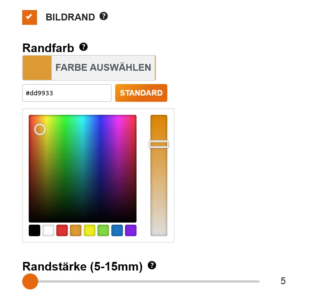 Setze beim Bestellvorgang einfach einen Haken bei Bildrand und wähle die gewünschte Randbreite und Farbe aus. Unsere benutzerfreundliche Oberfläche macht es Dir leicht, Deine individuellen Wünsche umzusetzen und den perfekten Bildrand zu gestalten.